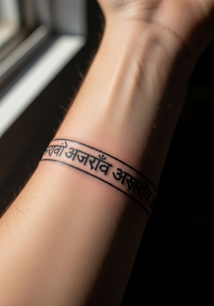 There is a visual impact to a mantra band. The forearm tolerates longer sessions and feels moderate on the pain scale. When getting repeating text, tell your artist you want consistent kerning and even letter spacing. From what I’ve seen, uneven letter height across the band looks sloppy once healed. I find Hustle Butter helps during the transition from scab to settled ink for larger bands. Avoid tiny repeat scripts in narrow bands. They compress and become unreadable after a year.