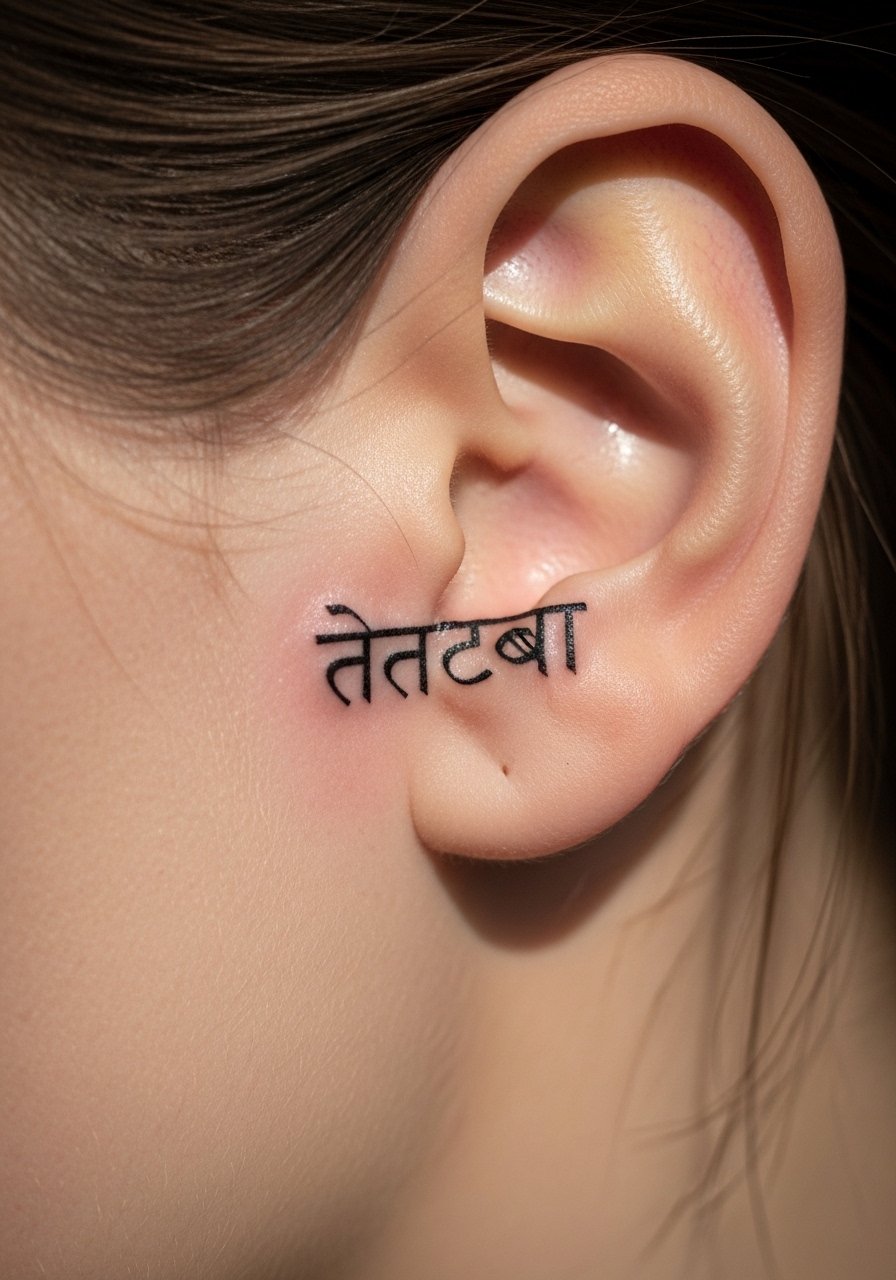 One mistake people make is underestimating scale behind the ear. Tiny glyphs can become smudged if they are smaller than a thumbprint. I recommend a size that reads at arm’s length. Pain is mild. Tell your artist you want the characters slightly bold and simple. From what I’ve gathered, compact but solid letters survive better than micro-detail in that spot.