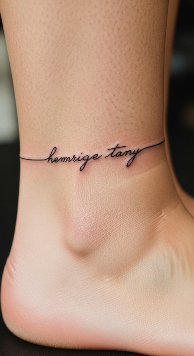 An ankle script band looks refined but can sting—thin skin and bone mean higher pain. Lines settle into the skin and sometimes soften within months. Keep the font slightly bold so letters don’t merge. Healing can be slower if shoes rub the area; avoid tight footwear for the first week. This is a subtle, meaningful option for someone wanting a discreet, timeless line.