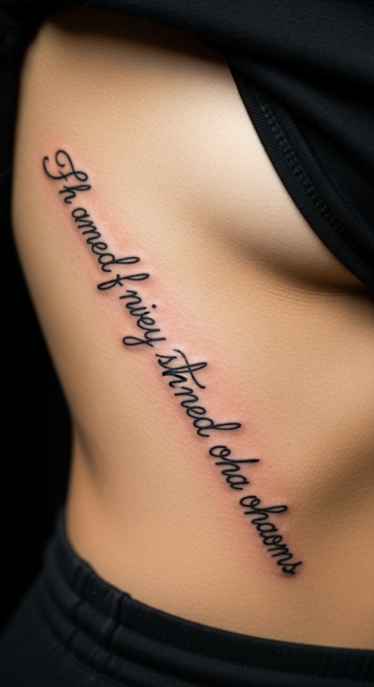A rib quote reads intimate and stays hidden when you want. Pain is high because ribs are sensitive; expect longer sessions and breaks. Healing needs gentle care—no tight clothing or strenuous movement. Script here looks gorgeous when spaced well; overcrowding letters leads to blurring. Choose an experienced fine-line artist who spaces letters for long-term legibility.