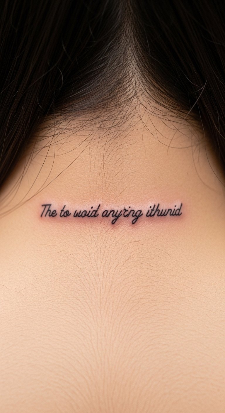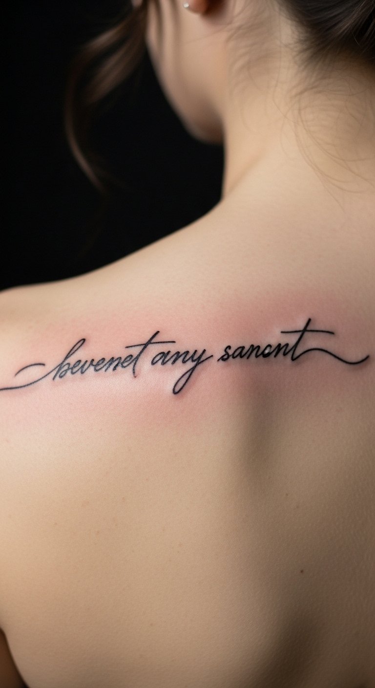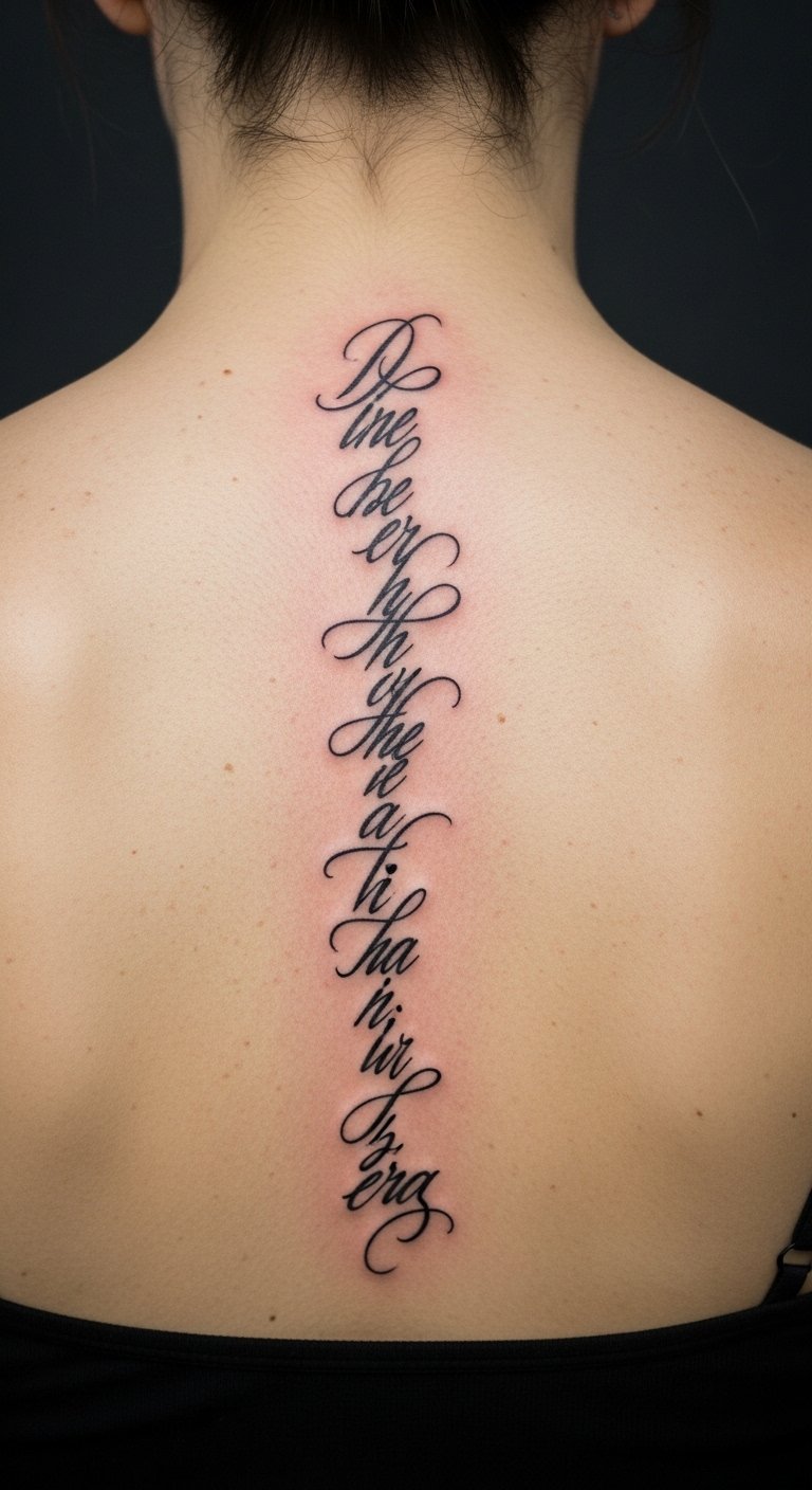 Spine script makes a dramatic statement and follows natural lines. Pain can be intense on vertebrae. Sessions may be split. Healed result is striking if spacing is generous. Avoid tiny flourishes that will blend. Skincare is critical because this area gets less sun but more clothing friction. Ask for durable downstrokes.