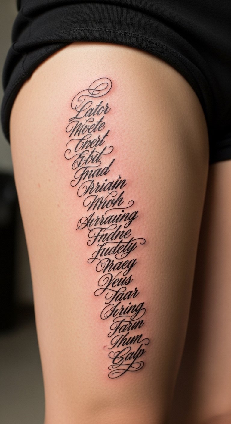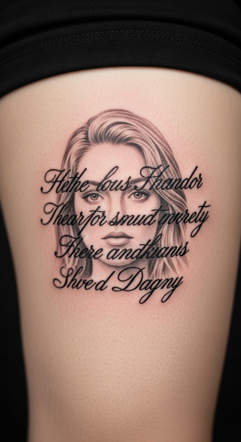 Overlaying script on portraits requires planning so letters don’t get lost. Thigh is a forgiving canvas. Expect multiple sessions. When done right, the text reads as a caption to the image and keeps its emotional weight.