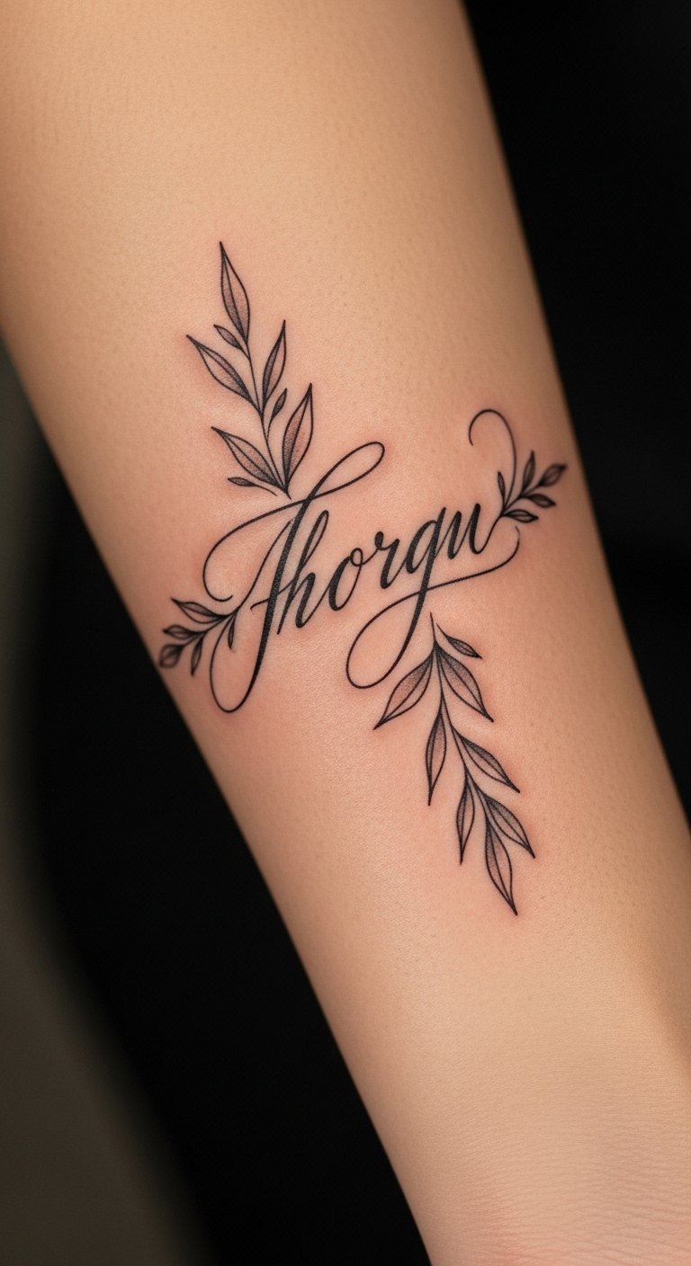 Combining script with botanicals softens the text and gives visual interest. The forearm is ideal—low pain and stable surface. The trick is balancing ornamentation so the words remain readable. Healing is typical; keep plants inked lightly to avoid heavy scabbing. This style feels organic and timeless when spaced well.