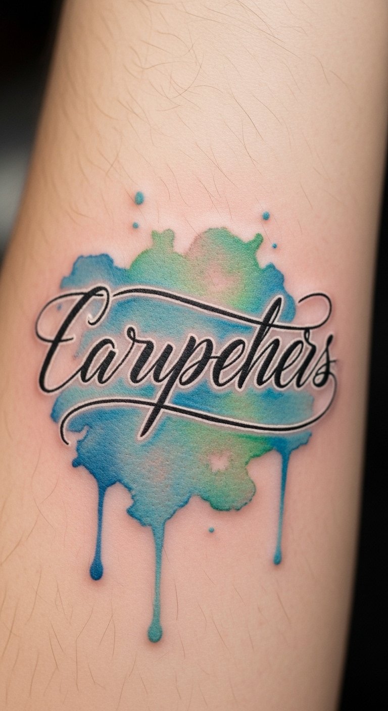 Watercolor behind script adds color without compromising legibility if the script is solid black. Colors fade faster, so use them as accents. Forearm placement is ideal. Expect gentle soreness and follow color-specific aftercare. This combination reads modern and emotive.