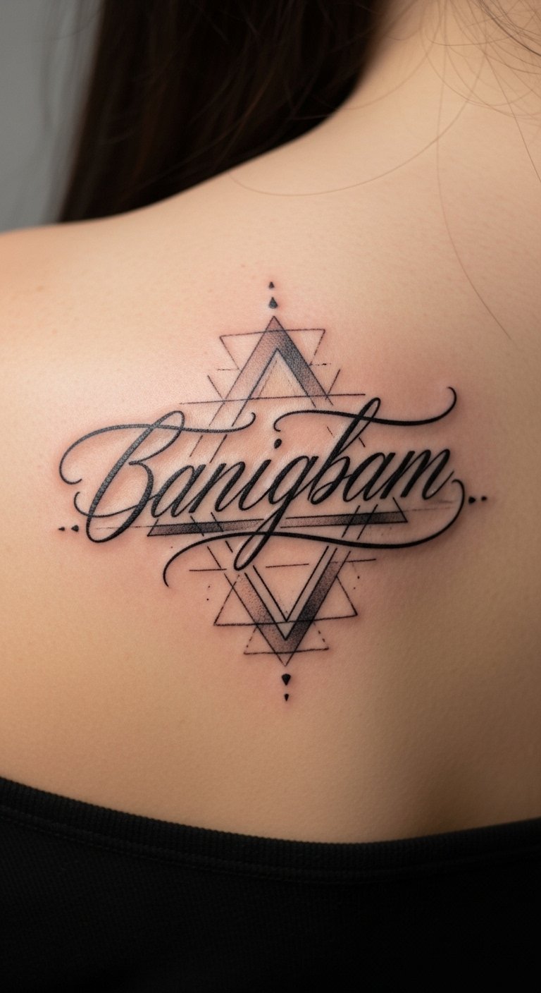 Pairing script with geometric shapes gives modern structure. Shoulder blade is low-pain and heals well. Keep the script bold against the shapes so letters remain dominant. This pairing is a fresh angle many artists are exploring now.