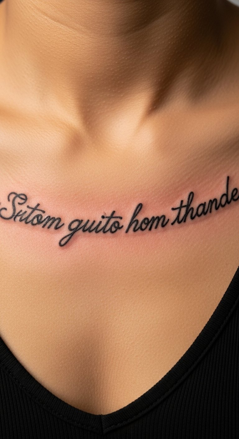 Brush calligraphy follows collarbone curves beautifully. The placement lets the letters breathe. Pain is moderate because of thin skin over bone. Heals in 2–3 weeks on the surface but avoid heavy clothing rubbing. Ask your artist for thicker downstrokes to keep the script readable as it ages. This style is timeless but shows line weight changes over years.