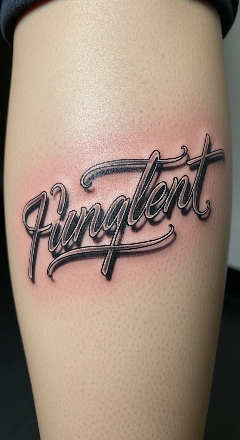 Calf script handles illustrative shadowing well and stays legible long-term. Low pain and easy healing. This placement is excellent for longer phrases with decorative shading that ages nicely.
