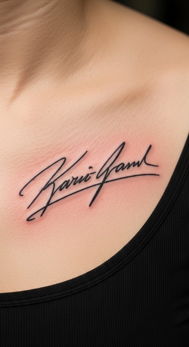 A signature tattoo feels intimate—like wearing handwriting. Ensure the original is crisp and the artist translates pen pressure into durable strokes. Upper chest is good for visibility and longevity. Avoid tiny flourishes that blur.