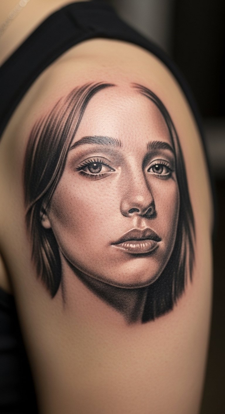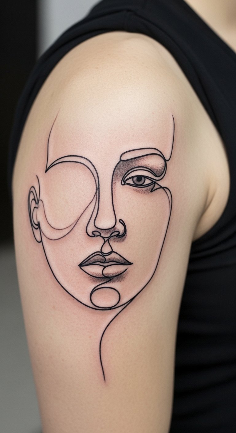 Surreal line portraits look dynamic on the shoulder if the composition flows. Small shaded touches need a skilled hand. Expect medium soreness. Discuss how the piece will age and where to place denser shading.