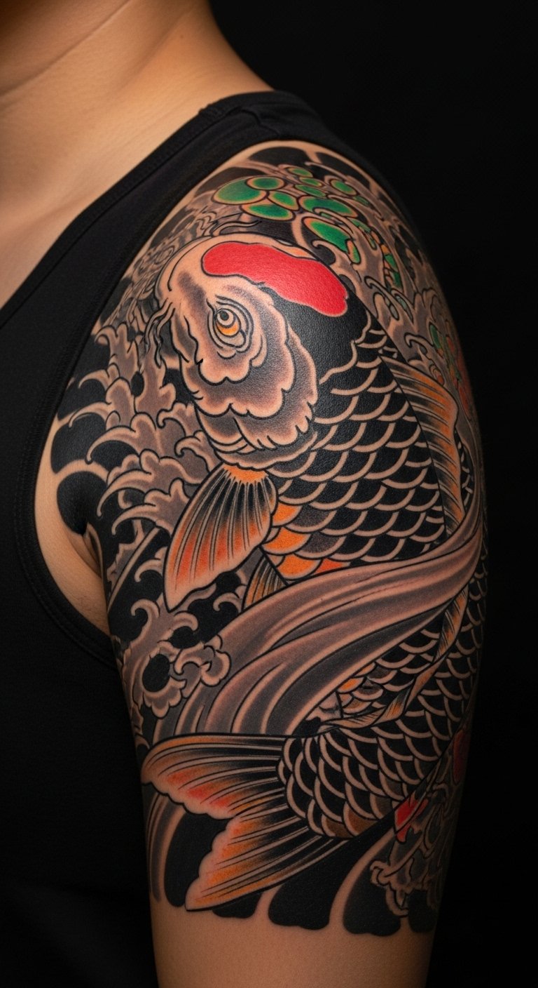 Koi and waves use shoulder shape to imply motion. Sessions depend on size. Expect medium pain near the joint. Large color blocks age well if laid deep enough. A common misstep is cramming too much detail into the deltoid—plan flow across adjacent areas.