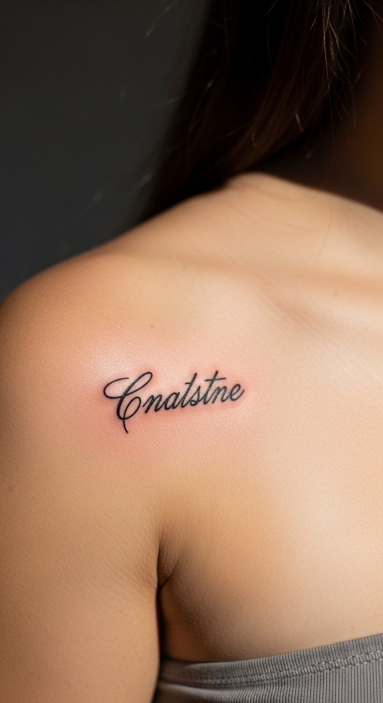 Script that follows the shoulder curve looks intentional. Keep font slightly bold for longevity. Avoid tiny cursive that blurs. Pain is minimal. Ask for examples of healed script on shoulder placements.