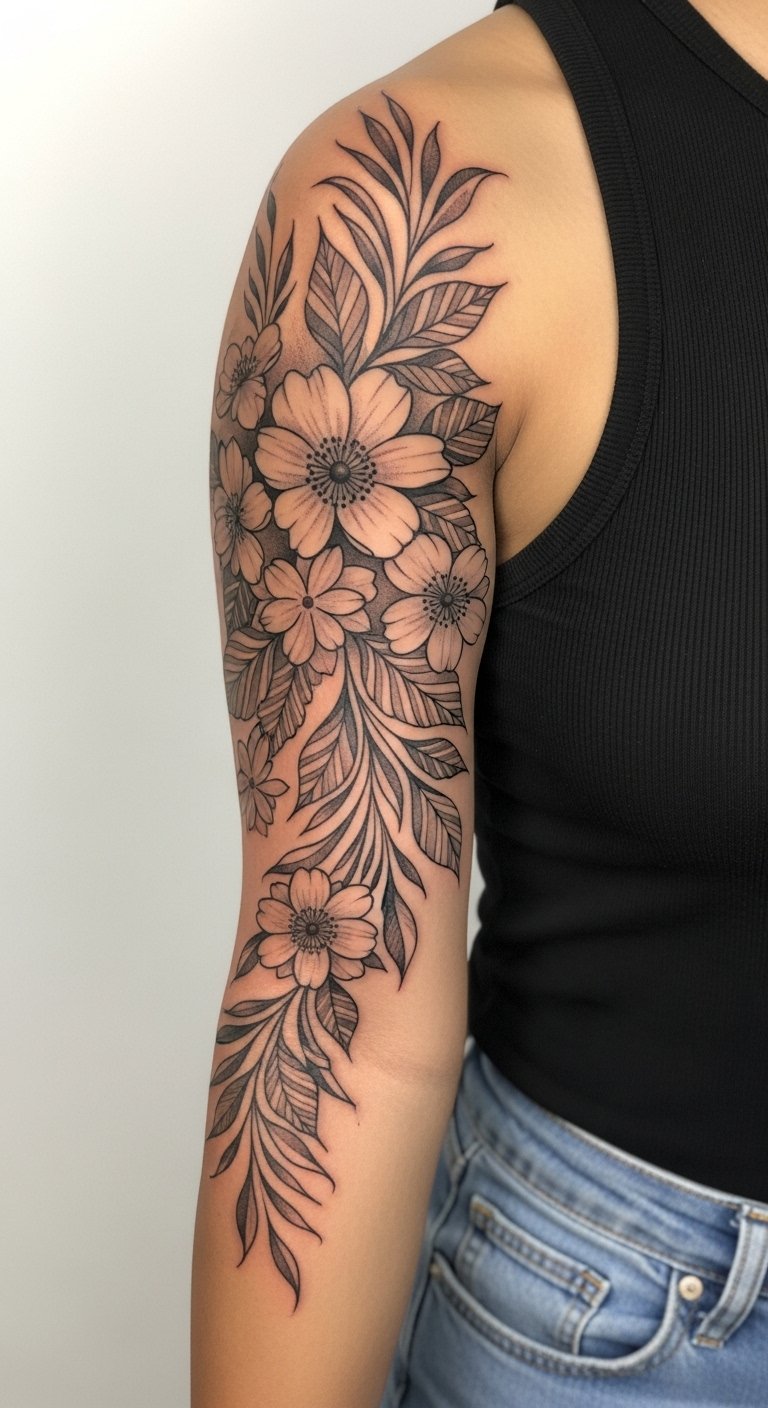 A shoulder-rooted half-sleeve lets you expand later. Sessions vary. Healing is gradual. The shoulder anchors the composition; avoid forcing symmetry—let elements curve naturally. Bring reference photos of flow, not just isolated flowers.
