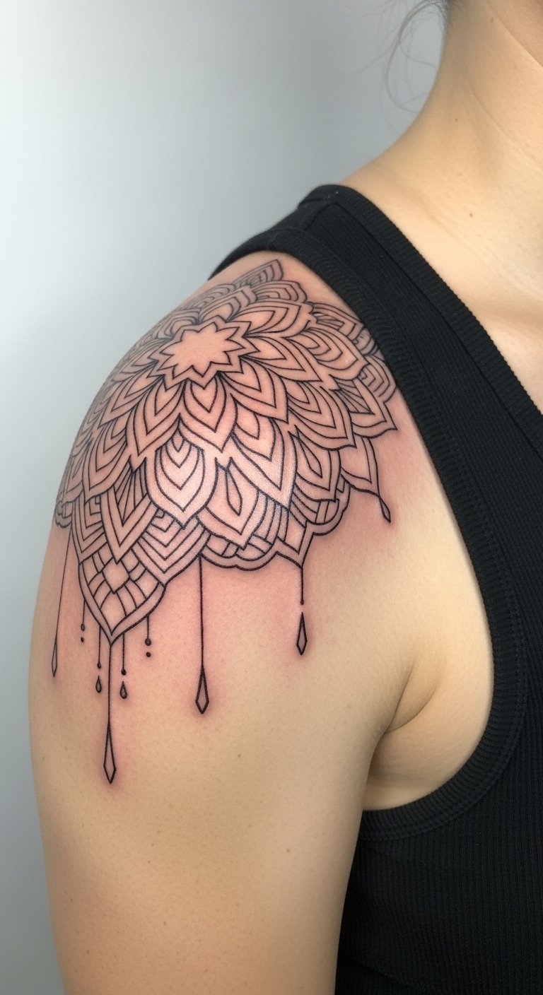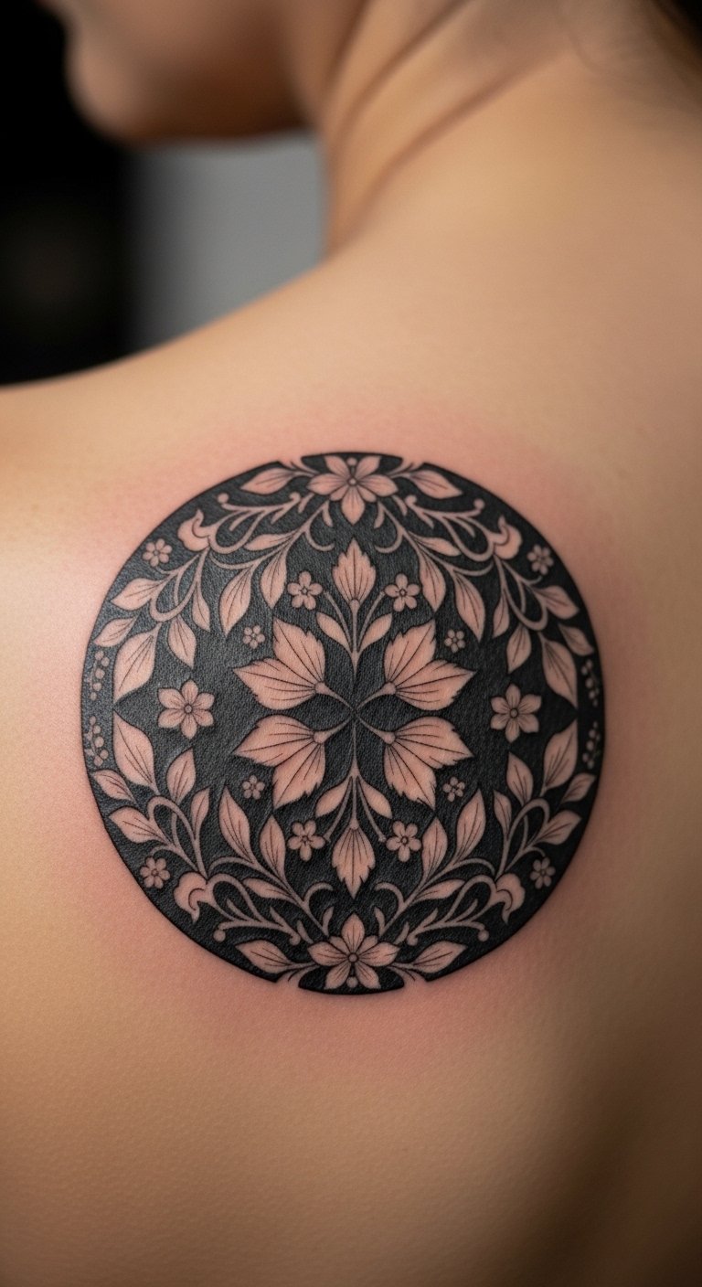 Medallions center the shoulder as a focal point. Negative space adds delicacy while staying bold. Healing needs careful moisturizing to keep edges crisp. Check healed examples for contrast retention.