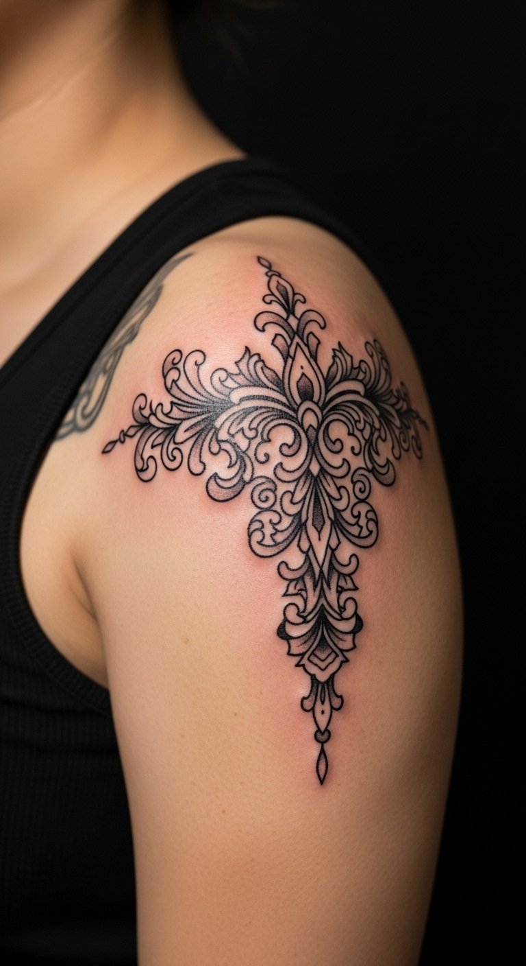 Filigree accents contour the shoulder beautifully. Avoid overly thin curls that can bleed. Medium pain. Ask for healed pictures to confirm line stability.