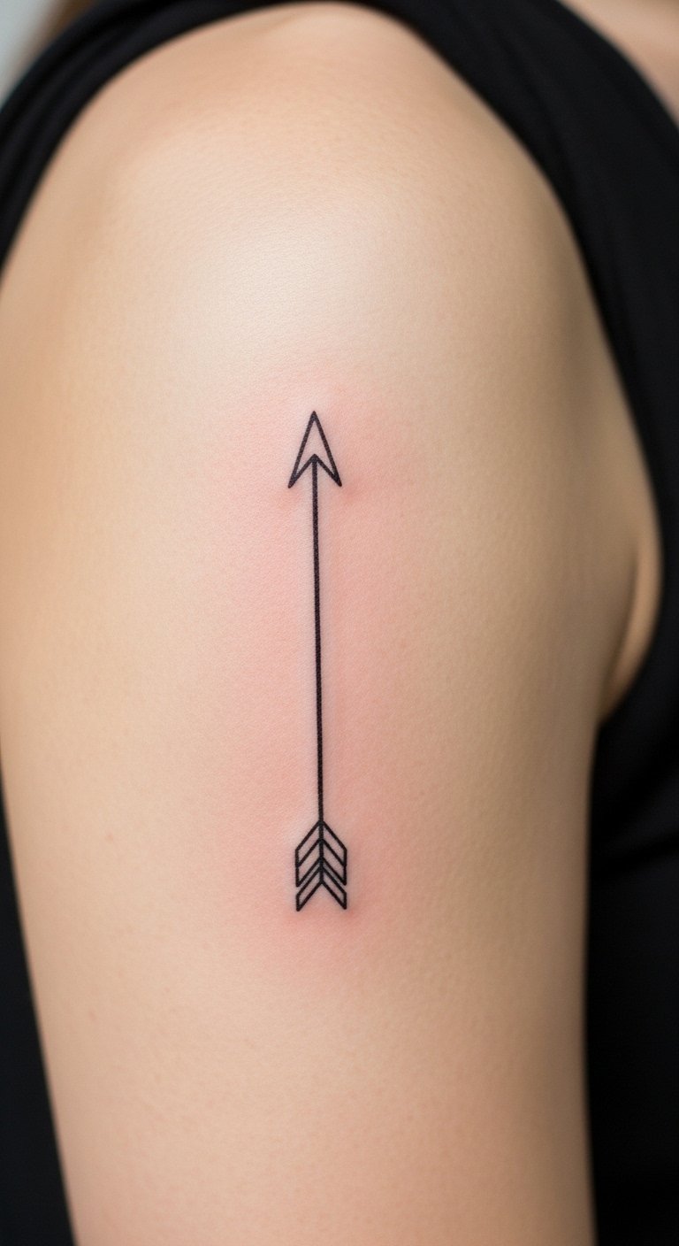 Arrows give subtle motion and suit first-time shoulder tattoos. Very low pain and fast healing. Keep line weight a touch heavier than micro lines to avoid blur. Ask for healed shots of similar placements.