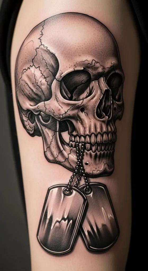 This style works as a tribute piece for those who want to honor someone. Draw the skull first, then add the chain in loose curves. Keep the tags simple with blank shapes. This design fits the chest or upper arm. For an inexpensive approach, stick to line work without trying to mimic metallic shine. You can test chain placement by laying a real chain on your arm and snapping a quick photo.