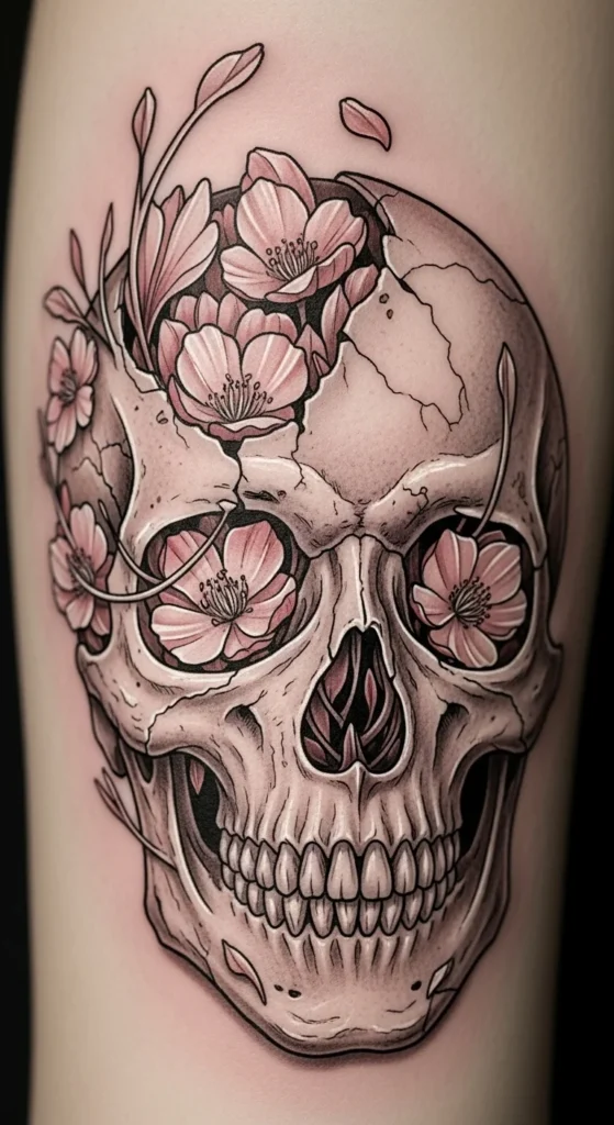 This concept brings life inside the skull’s shape. Draw the skull outline lightly, then fill the inside with blossoms instead of bone details. It’s a gentle contrast many people enjoy. Try daisies, lilies, or even small wildflowers. This piece fits the upper arm or thigh well. If you want to practice at home, trace flower shapes behind a skull outline on tracing paper. Layering makes it simple and low-cost to experiment.