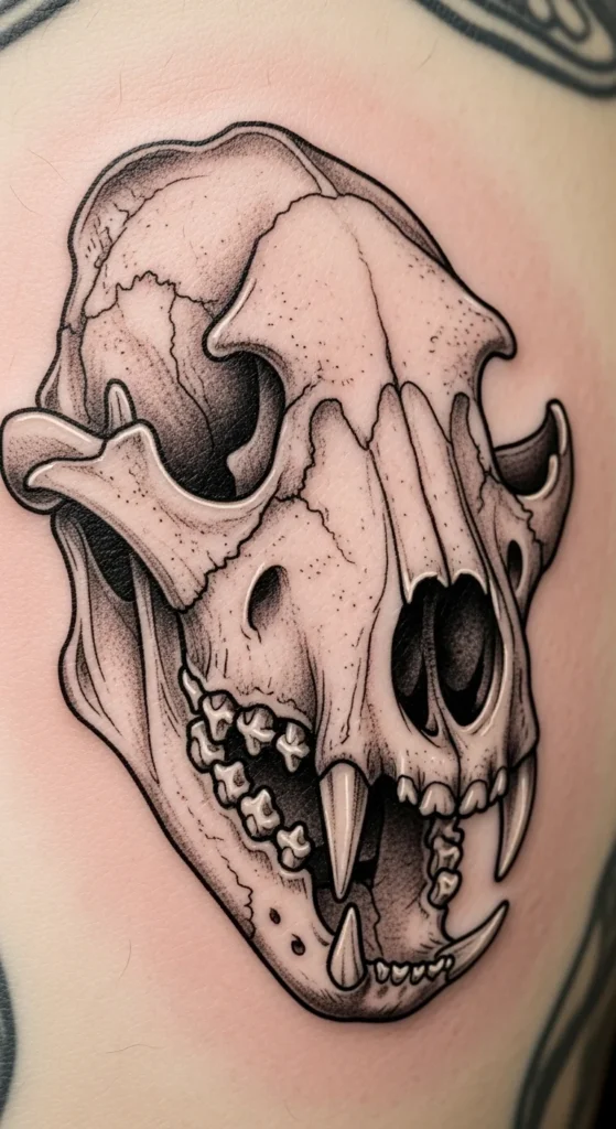 A bear skull carries a strong, protective mood. Its wide features work well for shoulders or upper backs. Start your sketch by outlining the broad jaw shape. Add deeper shadows around the eye sockets so the face looks powerful. If you want to keep the cost down, choose a smaller version near the collarbone. Save heavier shading for a later session. It still looks intentional even with simple line work.