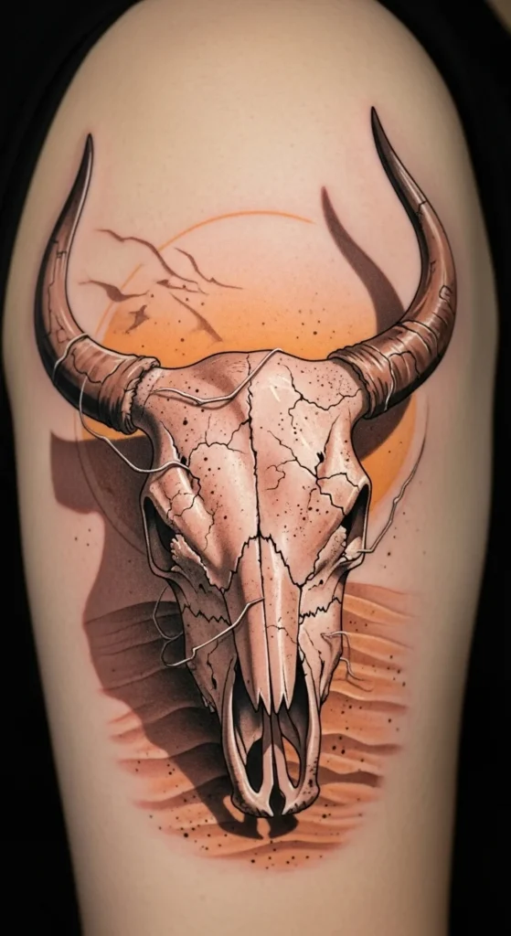 Bull skulls bring a rugged, grounded energy. They look great on forearms or thighs thanks to the long horn span. Draw the horns first to set the width. Then lightly add cracks and grooves to the bone. If you want more personality, add small desert plants or tiny geometric shapes. For DIY testing, print a simple bull skull outline and tape it to your arm to visualize placement. It’s an easy way to see if the horns flow with your muscles.