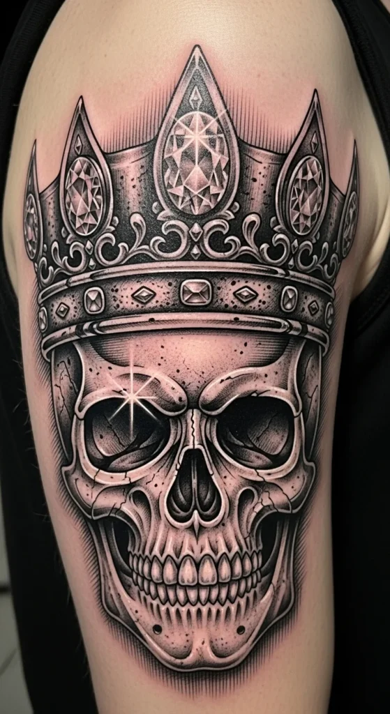 A crown adds a sense of personal leadership to a skull tattoo. Draw the crown wide so it doesn’t look squeezed on top. Add a few curved lines to mimic metal texture. This look suits the upper chest, where the shape fits nicely. If you’re saving money, keep the crown simple with line work. You can explore textures with gel pens on paper before choosing what to keep in the final design.