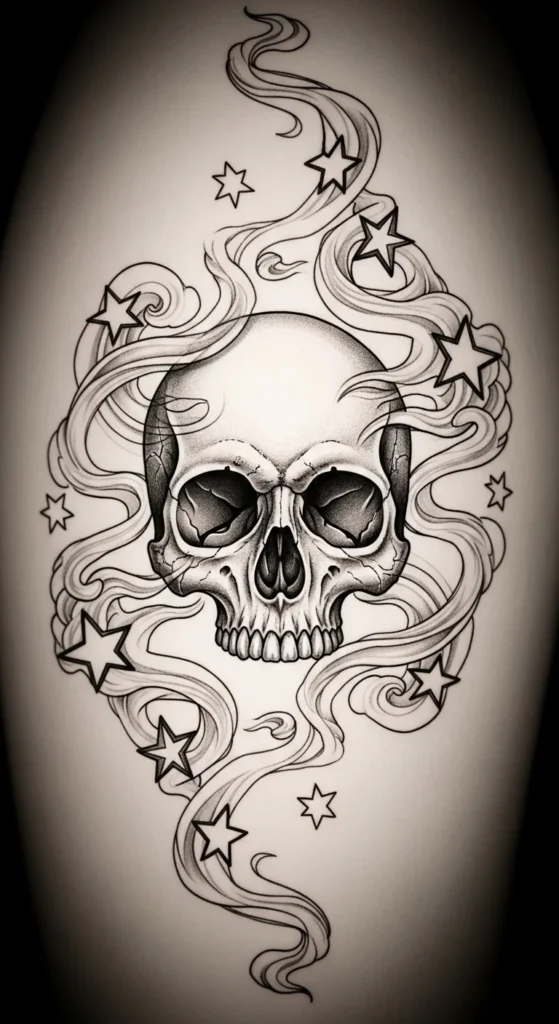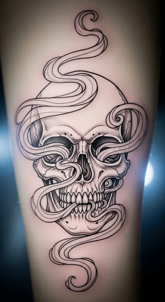 Smoke adds movement to a skull tattoo without requiring color. You can keep the lines light and wispy, almost like fog. Start with loose pencil curls around the jaw, then make them darker where the smoke overlaps. This design looks striking on the back or upper arm. To keep things simple, stick with black lines and fade them using light shading. Practice smoke shapes on scrap paper using charcoal, which gives a natural blend. It’s a budget-friendly way to brainstorm before committing to ink.