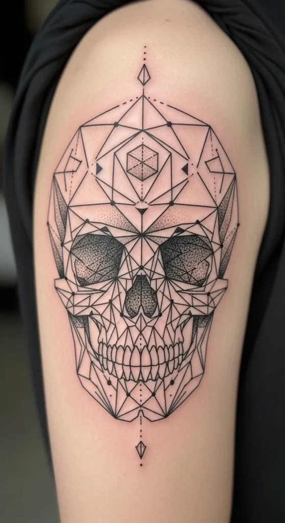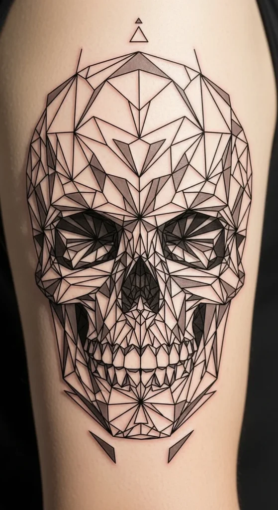 Geometric skulls use shapes to build outlines that feel modern and graphic. Start with a grid on paper so the angles stay balanced. You can keep it simple with just a few shapes or add layered lines for depth. This style works well on shoulders or calves because those areas give the shapes room to breathe. If you want to test it at home, cut small triangles from paper and arrange them until you find a layout you like. It’s a low-cost way to experiment without buying expensive tools.