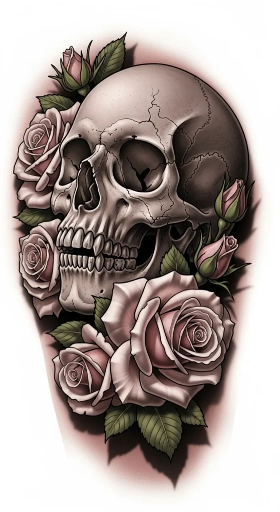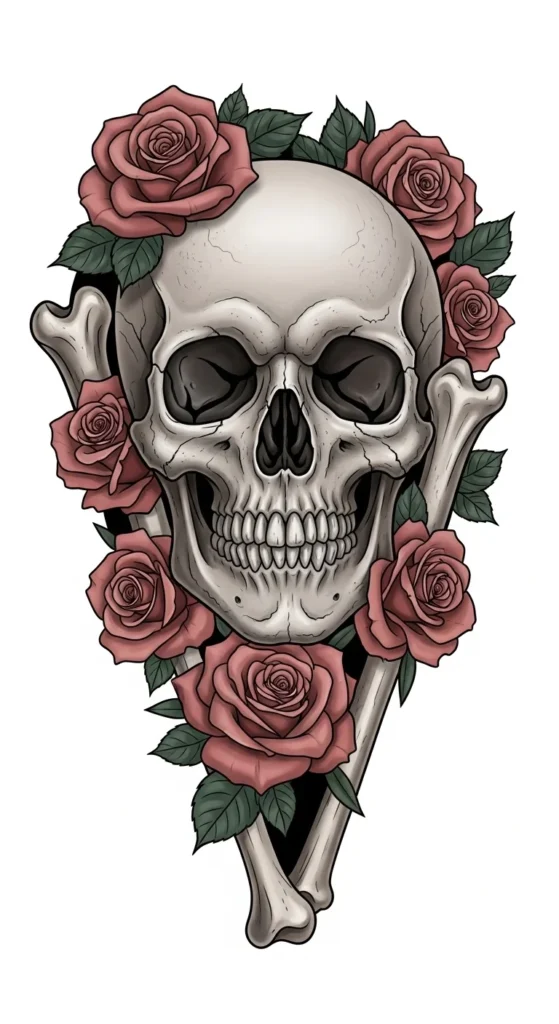 A skull paired with roses shows the balance between beauty and the end of life. It’s popular because it looks strong but also thoughtful. Try drawing the roses first, then placing the skull behind them. This helps avoid crowding. For a more personal touch, choose rose shapes that match your favorite style—tight petals or open blooms. A chest or shoulder panel works well if you want bigger details. To keep the process affordable, choose black and grey shading instead of color. A simple spray of leaves can make the piece feel larger without extra cost.