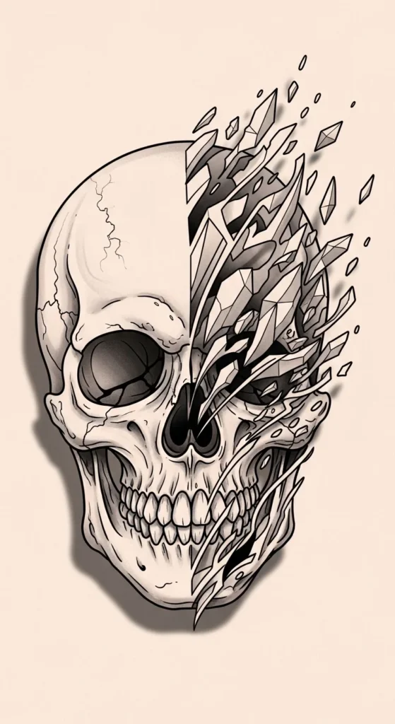 Split skull designs feel artistic without needing heavy detail. One half remains a skull while the other fades into shapes or shadows. Start with a clean center line, then break the second half into fragments. This works well on thighs or upper arms. To test the look, tear small pieces of paper and place them over a skull drawing to mimic fragmented edges. It’s an inexpensive way to explore the style.
