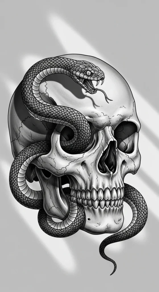A serpent through a skull brings a dramatic twist. Draw the snake first to control the path. Then sketch the skull around it. This helps avoid awkward overlaps. This design fits the forearm nicely because the snake can curve along the muscles. If you want to keep things simple, use clean line work without scale details. You can always add texture later. Try practicing the snake curve using ribbon strips to find the right flow.