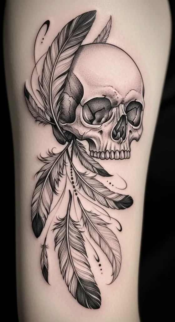 Feathers give a gentle contrast to the skull’s structure. Sketch long feather shapes on the sides or hanging from cracks. This layout fits the upper arm or calf well. If you prefer a low-cost version, keep feather lines simple without extra shading. Practice feather strokes using a soft pencil to keep them light and airy. You can also add small dots or lines to mimic texture without making the piece too busy.