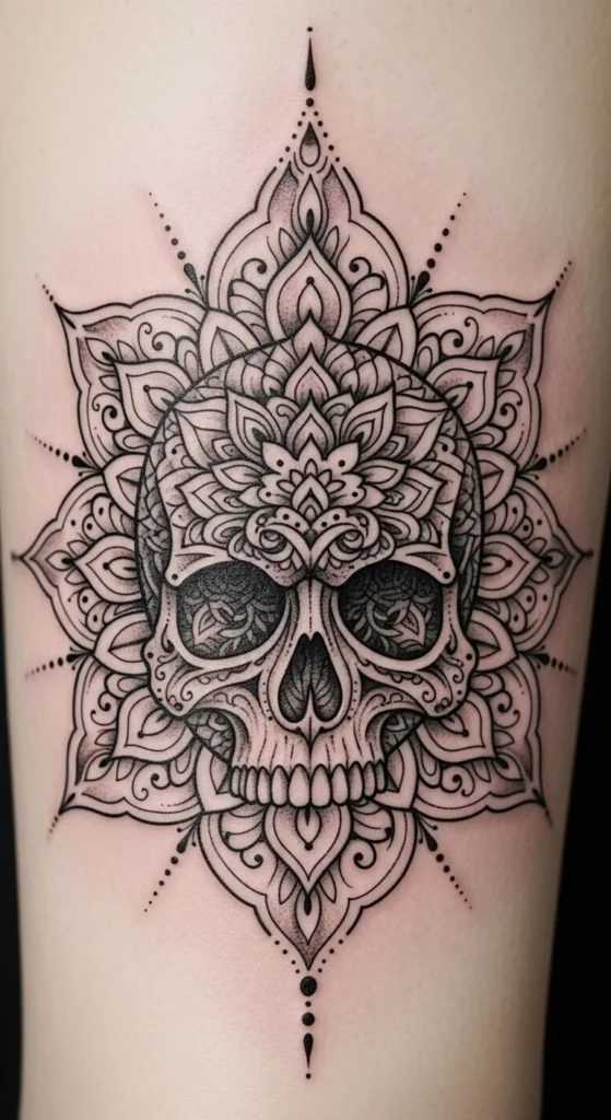Mandala patterns add steady, calming structure to the skull shape. Start with a circle behind the skull and build outward using small repeating shapes. This works well on the upper back or thigh. You can practice by folding paper into quarters to keep patterns balanced. Use thin markers for testing so you can explore dot patterns before committing to ink. Keeping the mandala small helps control cost and avoids long appointments.