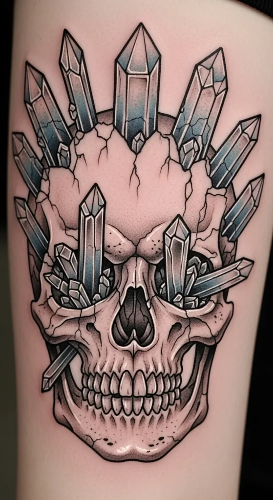 Crystal shapes give a magical twist to skull designs. Draw simple diamond shapes first, then angle them outward. Place them on the crown or around the cheekbones. This design fits nicely on the calf or upper arm. To try the idea cheaply, use colored pencils to test how crystal highlights look. Adding just a few shards keeps the piece clean and avoids long sessions.