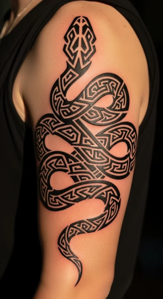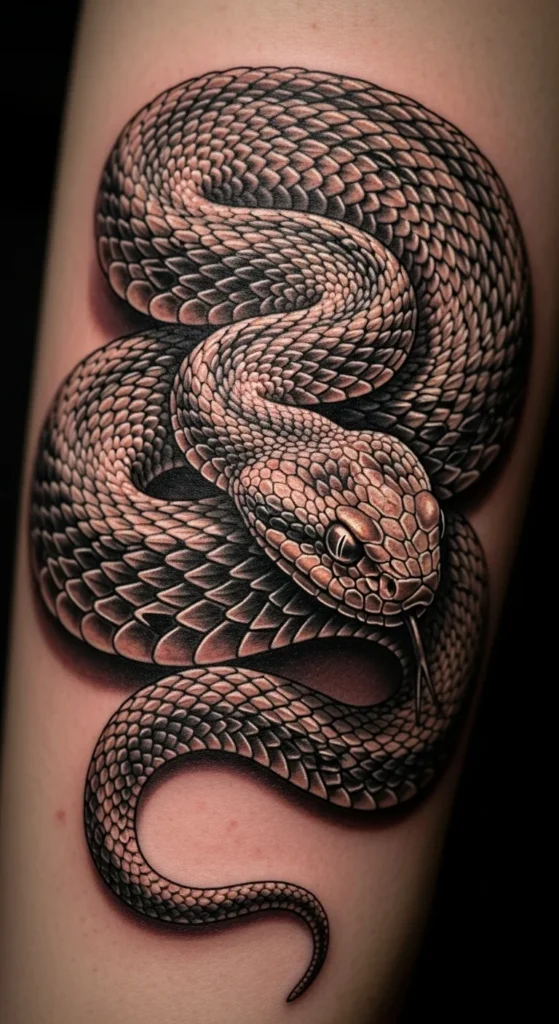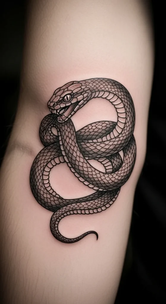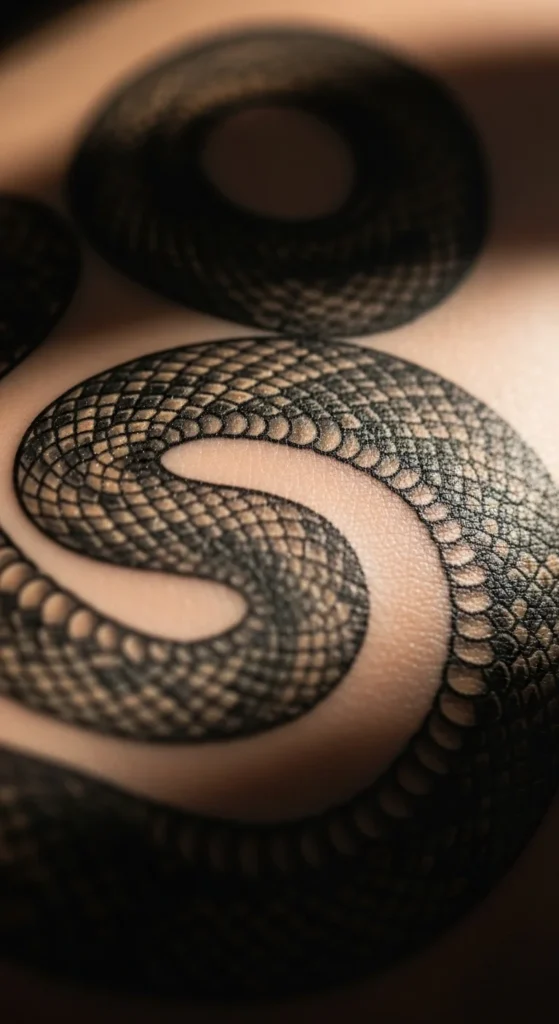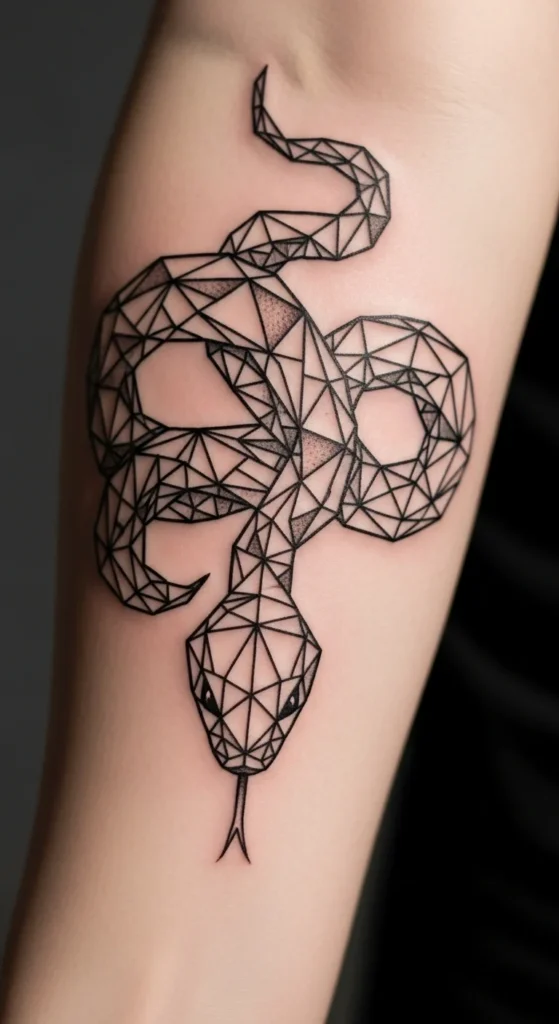 Geometric snakes feel clean and modern. They suit people who enjoy symmetry or minimal shapes. The design relies on straight lines, so choose areas where the skin stays firm—like the forearm or calf. If you’re keeping costs low, limit the number of shapes and focus on bold outlines. Print a few geometric templates online and place them on your arm to see what size feels comfortable. Because the style is graphic, healing cleanly matters—keep the area moisturized and avoid sun exposure during the first week.