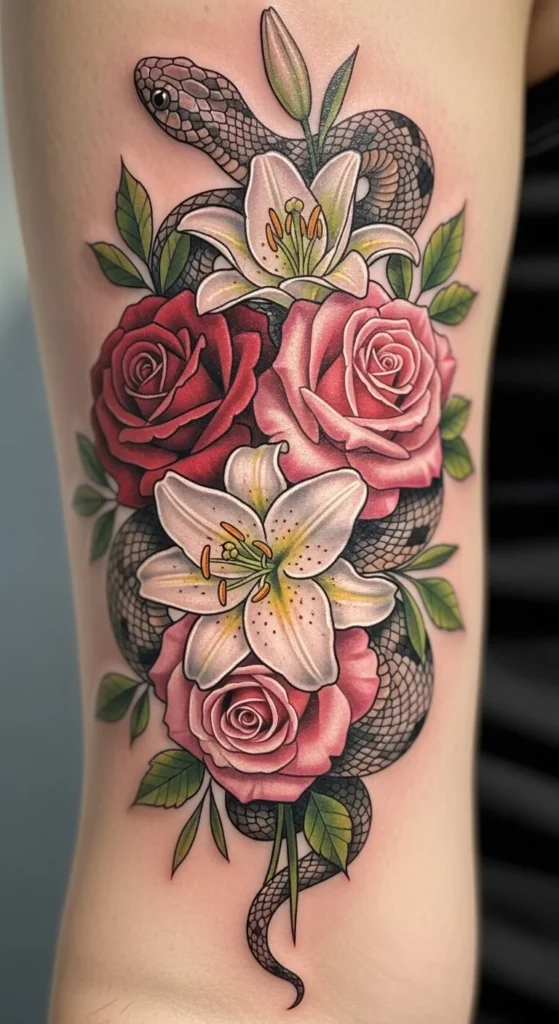 Flowers soften the intensity of a snake tattoo and add personal symbolism. Choose blooms that mean something to you—like roses for passion or lilies for calm energy. To lower the cost, pick one main flower and keep the petals outlined instead of shaded. You can draw simple flower shapes at home to see how they blend with the snake’s curve. If you want something romantic, ask for loose vines. If you prefer structure, request symmetrical petals. This design fits thighs, ribs, or forearms. Take breaks during the session because floral shading can take time.