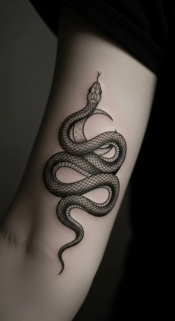 Snakes and moons work well together because they both symbolize internal change and self-awareness. You can place this design on the forearm, shoulder, or ribs. Keep it simple with thin outlines to reduce cost. If you want something more personal, add tiny stars or dots along the snake’s path. Sketch a moon at home using a bottle cap as a guide. Then curve the snake around it to see if you like an open or closed shape. Avoid tight clothing while it heals since ribs and shoulders rub easily.