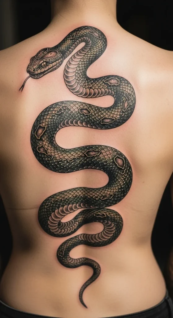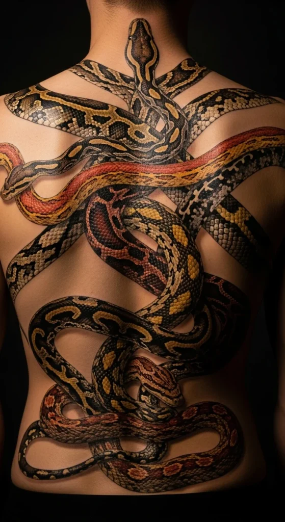 Multi-snake concepts feel expressive and artistic. You can choose two or three snakes moving in different directions for a dynamic look. To keep the price lower, stick to outlines first and add shading later. Have a friend help you trace loose curves on your back with a washable marker to test flow. Since backs heal slowly, keep the area moisturized and avoid picking at flakes.
