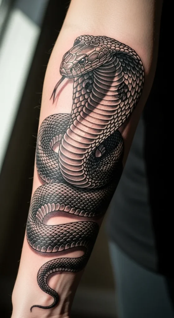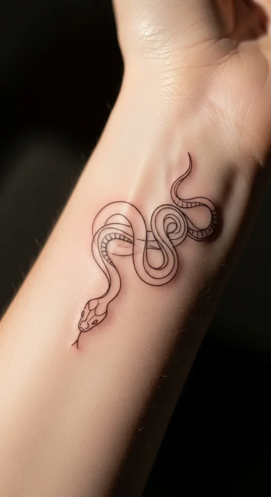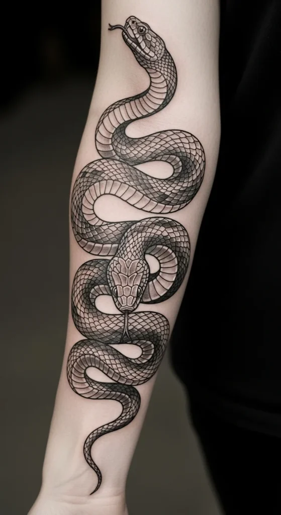 Vertical forearm tattoos look sleek and stylish. They’re visible without feeling overwhelming. You can choose a straight snake or add slight curves for movement. A black-ink version keeps the cost manageable. Print a snake silhouette and tape it on your arm to test width and length. This placement heals quickly and doesn’t hurt as much as bony areas. Use light lotion after the peel phase to keep the lines smooth.