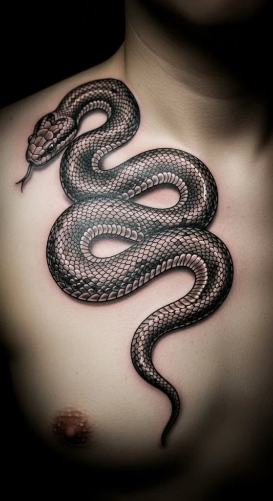 Chest pieces feel expressive and personal. A snake can follow the collarbone or dip slightly downward for a softer shape. Keep costs controlled with a single continuous outline. If you want something more dramatic, add shading in later sessions. Place a paper cutout on your chest to see how the curve looks with your body. Since chest tattoos can feel tender, break sessions into smaller parts.
