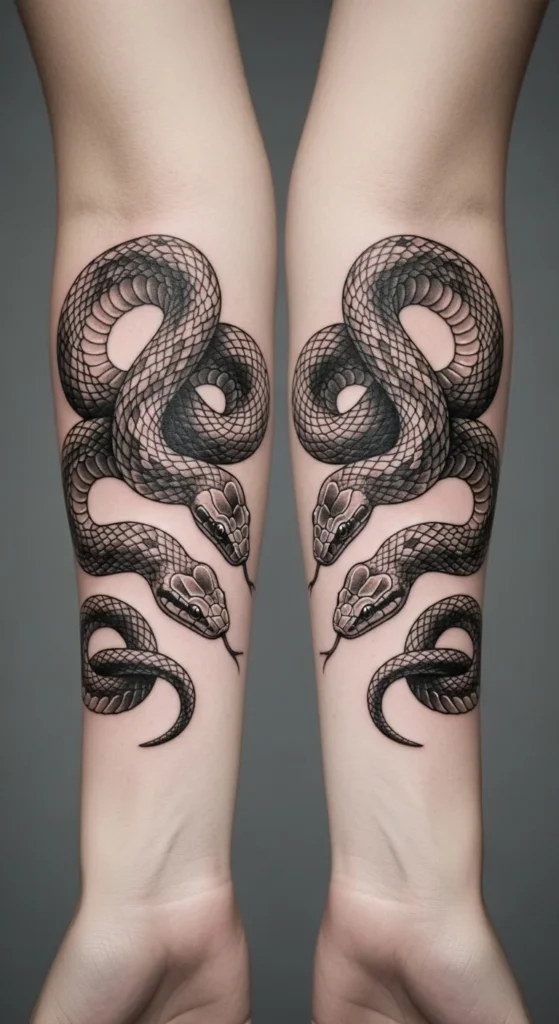 Two snakes create symmetry and balance. The design works well on the chest, back, or upper arms. Choose minimal shading to save money. You can draw two loose curves that mirror each other on paper to find a shape you like. People choose this idea to symbolize relationships, duality, or personal alignment. Healing is simple—just avoid pulling tight clothing over the area.