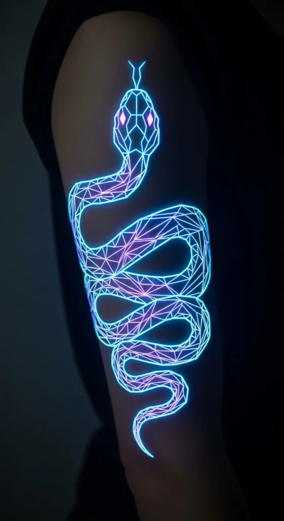 Cybersigilism feels futuristic and edgy. The sharp, glowing-style lines give the snake a high-tech mood. To keep the price reasonable, stick to a single neon color instead of multiple tones. Draw angular shapes on graph paper to experiment with direction. Choose spots like the outer arm or thigh where straight lines hold shape. Keep the tattoo covered from sunlight during healing, especially if you used bright pigments.