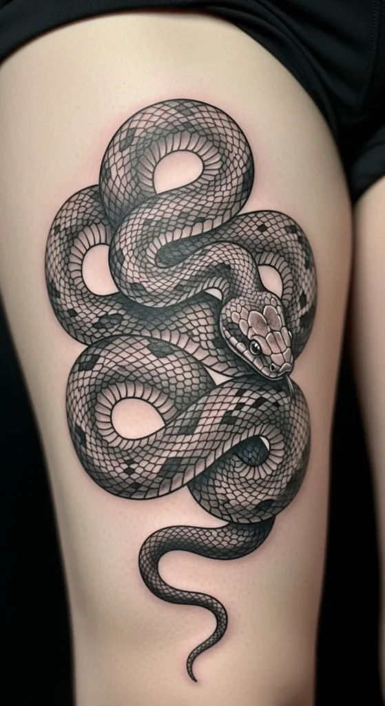 Thigh wraps feel romantic and dramatic. The larger surface area lets the snake curve naturally. Keep it budget-friendly with clean outlines and minimal fill. Draw a large curved line on your thigh with a washable marker to plan the direction. This placement hides well under clothing and allows more flexibility in size. Moisturize gently during healing to reduce irritation from fabric rubbing.