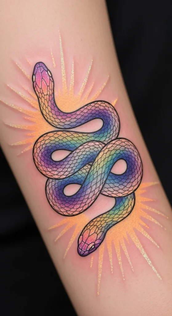 Inspired by the sunbeam snake’s natural glow, this idea focuses on color rather than symbolism. Soft greens and blues give a gentle shift depending on lighting. To keep the cost lower, choose fewer colors and focus on a small coiled section. This works beautifully on the inner arm or shoulder. Ask for subtle blending instead of heavy saturation. Avoid sun exposure while healing since bright tones fade quickly.