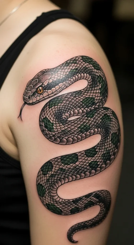 Shoulder curves make snake tattoos look natural and flowing. The rounded shape of the shoulder gives movement to the design. You can keep the shape simple or add light shading under the belly. Test placement with a curved line drawn using a washable marker. This spot heals well and feels comfortable during sessions. Wear loose tops for a few days to prevent friction.