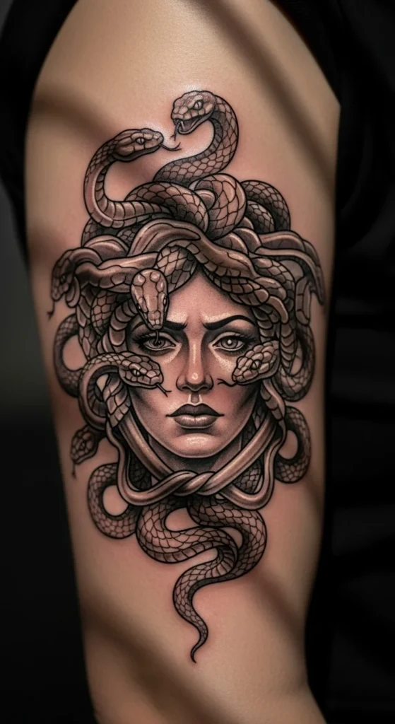 Medusa tattoos draw attention because they feel powerful and expressive. Many people choose them to show resilience after difficult periods. The snakes in her hair create movement, so the design suits shoulders, thighs, or upper arms. You can ask for a soft-shaded version to save time or choose bold outlines for a graphic look. If you want to keep the cost manageable, focus on the face and two or three snakes instead of a full crown. Sketch different angles at home to see if you prefer side-profile or front-facing styles. For a feminine look, add flowers or crescent moons around the edges. Healing can take longer if the design is large, so avoid tight clothing during the first week.