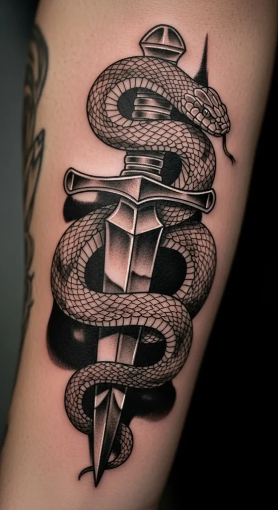 This pairing has a strong symbolic punch. The dagger represents defense, while the snake adds movement and personality. People often choose this design for the outer arm or calf so the details stay crisp. You can keep it affordable by asking for a black-ink version without heavy gradients. If you’re unsure of the size, print a few dagger shapes from online templates and tape them to your skin. Add a drawn snake around it to test the vibe. This idea suits people who want something edgy but still meaningful. Keep aftercare consistent since sharp lines look cleaner when they heal evenly.