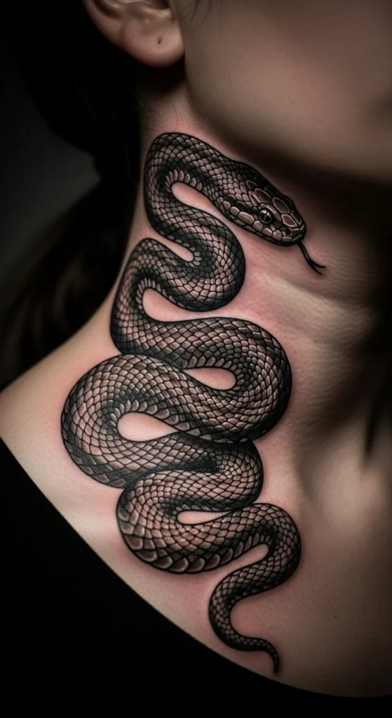Neck pieces feel daring and stylish. They stand out instantly. Because the area is sensitive, start with a smaller outline instead of a full shaded version if you’re concerned about discomfort. Artists often curve the snake along the jawline to match natural contours. You can practice with temporary tattoos first to make sure you like the visibility. Since neck skin moves a lot, keep aftercare simple: moisturize, avoid scratching, and sleep on soft pillowcases. If you want something softer, ask for a thinner outline. If you want drama, request open-mouth detailing or subtle scales.