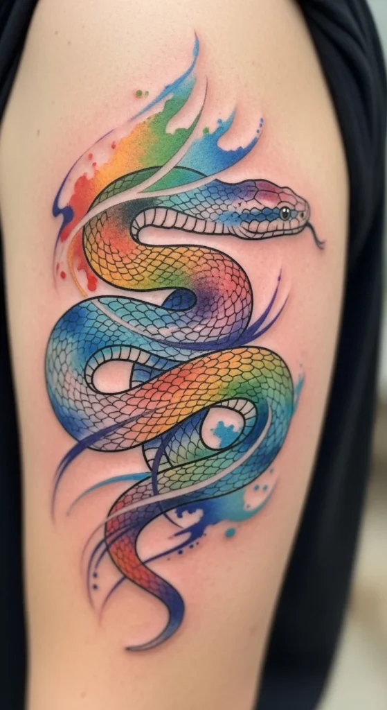 Watercolor designs feel expressive and artistic. They suit people who prefer color without strict outlines. The soft washes of blue, green, or red create movement, and the snake shape anchors the composition. To keep the cost lower, choose just one or two colors instead of a full gradient. You can sketch a loose paint-stroke snake at home by brushing diluted watercolor onto paper. This helps you decide whether you want splashes or soft clouds of color. The design works best on larger areas like the thigh or upper arm. Since watercolor tattoos rely on subtle shading, aftercare matters—keep the area out of the sun during healing.