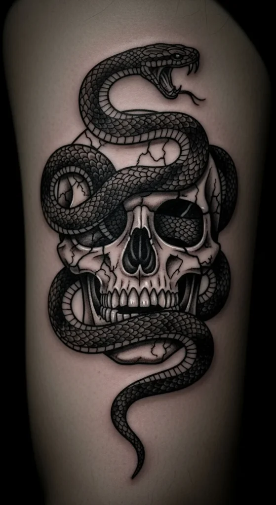 This aesthetic suits people who like dramatic or moody visuals. The snake adds movement while the skull creates a grounded focal point. If you want to keep the budget manageable, ask for a black-and-gray version with simple gradients instead of full realism. The combination works well on biceps, calves, or upper backs. Try sketching a small skull outline and tracing a curved line around it to plan the direction of the snake. This helps you decide how much wrapping you like. Clothing tends to rub these placements, so apply moisturizer during healing.
