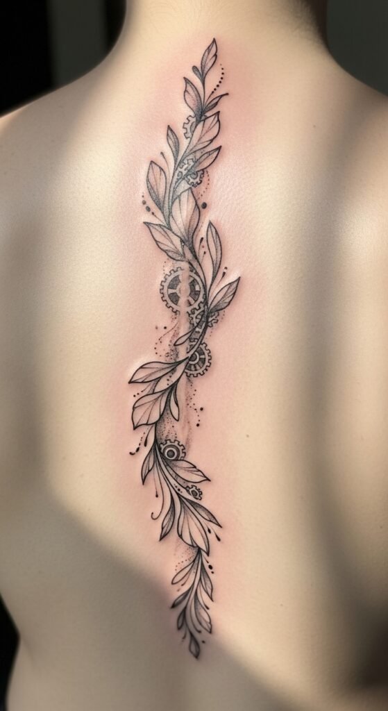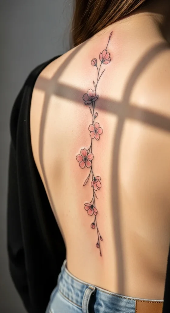 A cherry blossom spine tattoo feels soft yet powerful. The blossoms symbolize fleeting beauty and growth.