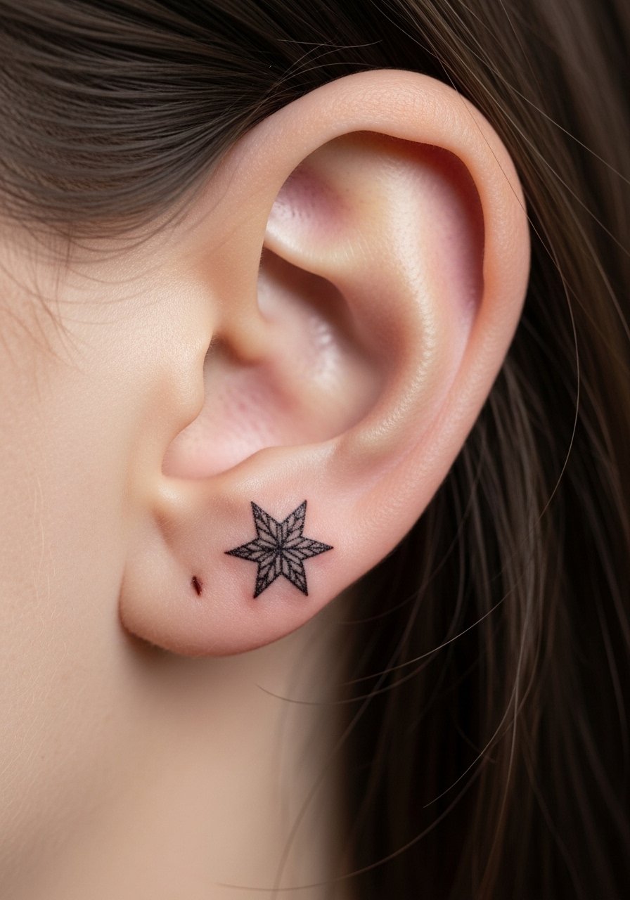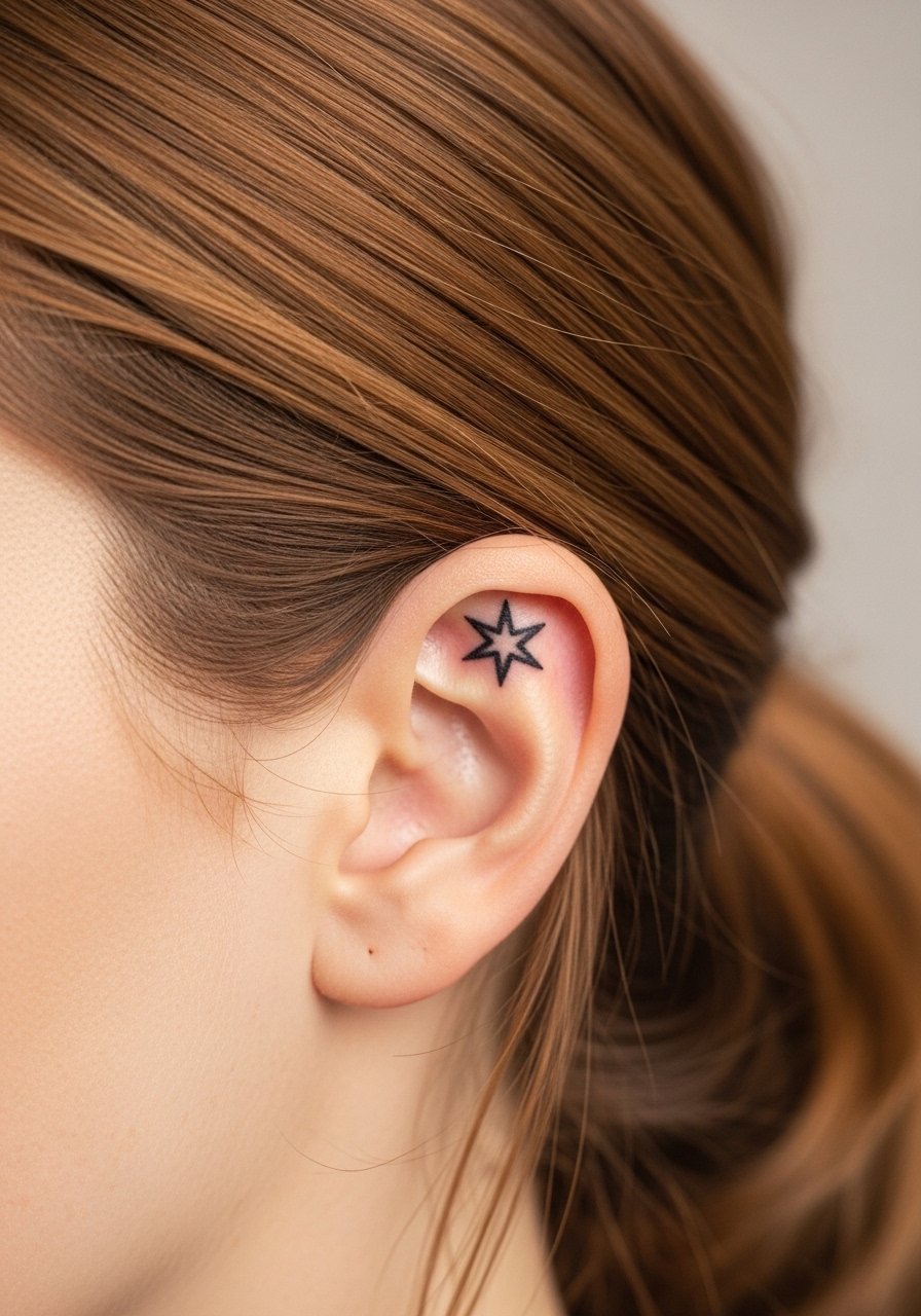 Helix work is noticeable and intimate. Expect moderate pain but quick sessions. Healed results look chic if lines are slightly bold. Keep the star small but not pinprick-sized.